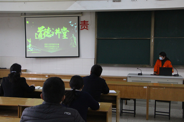 4月22日,信息工程学院党支部、信息工程学院分工会举行了2020年第一期道德讲堂,活动在6号楼C301会议室举行。主题为“大爱无疆、共抗疫情”。活动分为:诵一段经典、看一段视频、讲一个故事、听一首歌曲、谈一下感悟四个环节,活动由工会主席张宏主持,信息工程学院党员教师参加了此次道德讲堂。