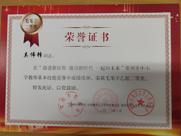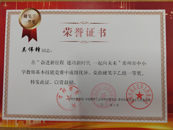近日,2022年“奋进新征程 建功新时代 一起向未来”常州市中小学教师基本技能竞赛落下帷幕。竞赛按照硬笔字、毛笔字、粉笔字、普通话等四个比赛类别,分甲、乙两组进行评选,对参与三项及以上的教师,择优评定全能奖。我校选送的作品经过区教育局遴选推送,在常州市级评选中获得了较好的成绩,其中,机械工程院吴伟锋老师的硬笔字作品获得了乙组一等奖,毛笔字作品获得了乙组二等奖,继续教育学院胡燕君老师在普通话比赛中获得了乙组二等奖。
