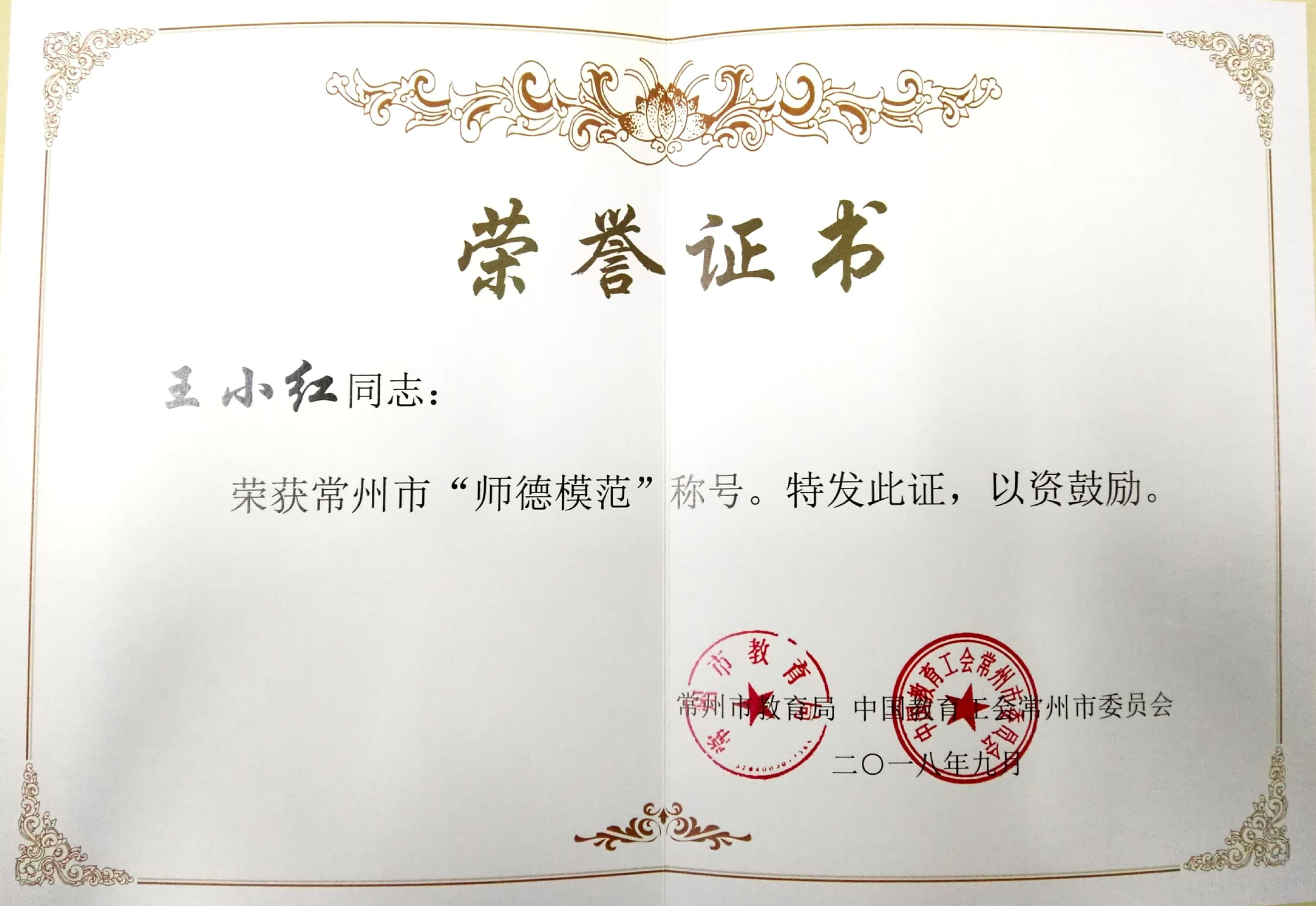 “中国教育系统年度论文评选园丁奖”、“全国优秀指导老师”、“江苏省优秀指导老师”、“常州市学科带头人”、“常州市骨干教师”、“常州市德育先进工作者”、“武进区骨干教师”、“武进区优秀教育工作者”、“武进区优秀班主任”、“武进区教科研先进个人”、“武进区优秀通讯员”、“武进区优秀党员”、“武进区最美女性”等称号是对王老师一片爱心的最好的回报。她用对教育事业的赤诚丹心,在自己的人生画卷上,涂上了浓墨重彩的一笔。