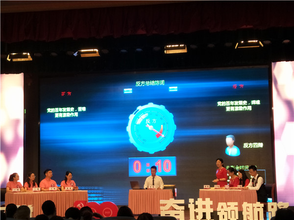 5月27日下午,决赛辩论赛在湖塘第二实验小学举行,评委现场打分。由初赛决逐入围决赛的32位武进区中小学教师组成了8个团队。选手们围绕“百年党史青春说”的主题,就组织培养和个人努力、苦难和辉煌等四个辩题进行了激烈的思想碰撞和理论交锋。每位参赛教师尽显青春活力,竞展青年风采。在此次辩论赛中,盛开老师所在的“青春向党队”围绕“党的百年发展史,苦难和辉煌哪个更有激励作用?”这个辩题和对方团队展开了激烈的辩论。作为反方四辨,盛开老师在总结陈词环节所做的精彩论述赢得了现场的阵阵掌声。