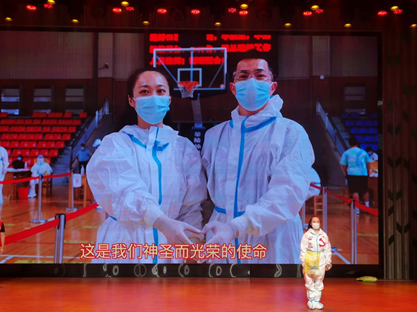 三十天的决赛备战过程充满了挑战和困难,也洒满了欢乐与温暖。本届决赛分为团队精彩展演和个人现场答辩两个部分。在全体成员的商议后,第四小组取名为“追光队”,至此,追光队的两位导师和七位队员便开始了为期一个月的“追光之旅”。吴馨钰老师在团队展演中主要负责“赤诚红”篇章的表演,她扮演了一位武进教育系统的青年志愿者,通过演绎志愿者在疫情期间为抗击疫情做贡献的事迹,形象地展现了青年志愿者的风貌;同时通过深情讲述,让更多的人了解到武进教育的青年志愿者们在抗疫、公益、支教、助学等各个领域默默无闻的无私奉献。“台上一分钟,台下十年功”,舞台上短短数分钟的表演,吴老师辛勤挥洒了一个月的汗水。为了让展演效果完美无缺,她先后组建了文案编辑、视频拍摄、音视整合、动作编排、图片处理等团队,虚心向前辈和专家学习,积极接受团队助手的建议,不怕苦,不喊累,一遍遍地修改,一次次地排练,一点点地进步。在备战决赛的这个月里,吴老师和她的伙伴们勠力同心,在千头万绪的排练中,废寝忘食、挑灯夜战已成为他们的青春标签。5月31日下午,决赛的舞台上,吴馨钰老师用精彩的表演和缜密的答辩,践行了她本次参赛“青春心向党,逐梦创辉煌”的诺言。