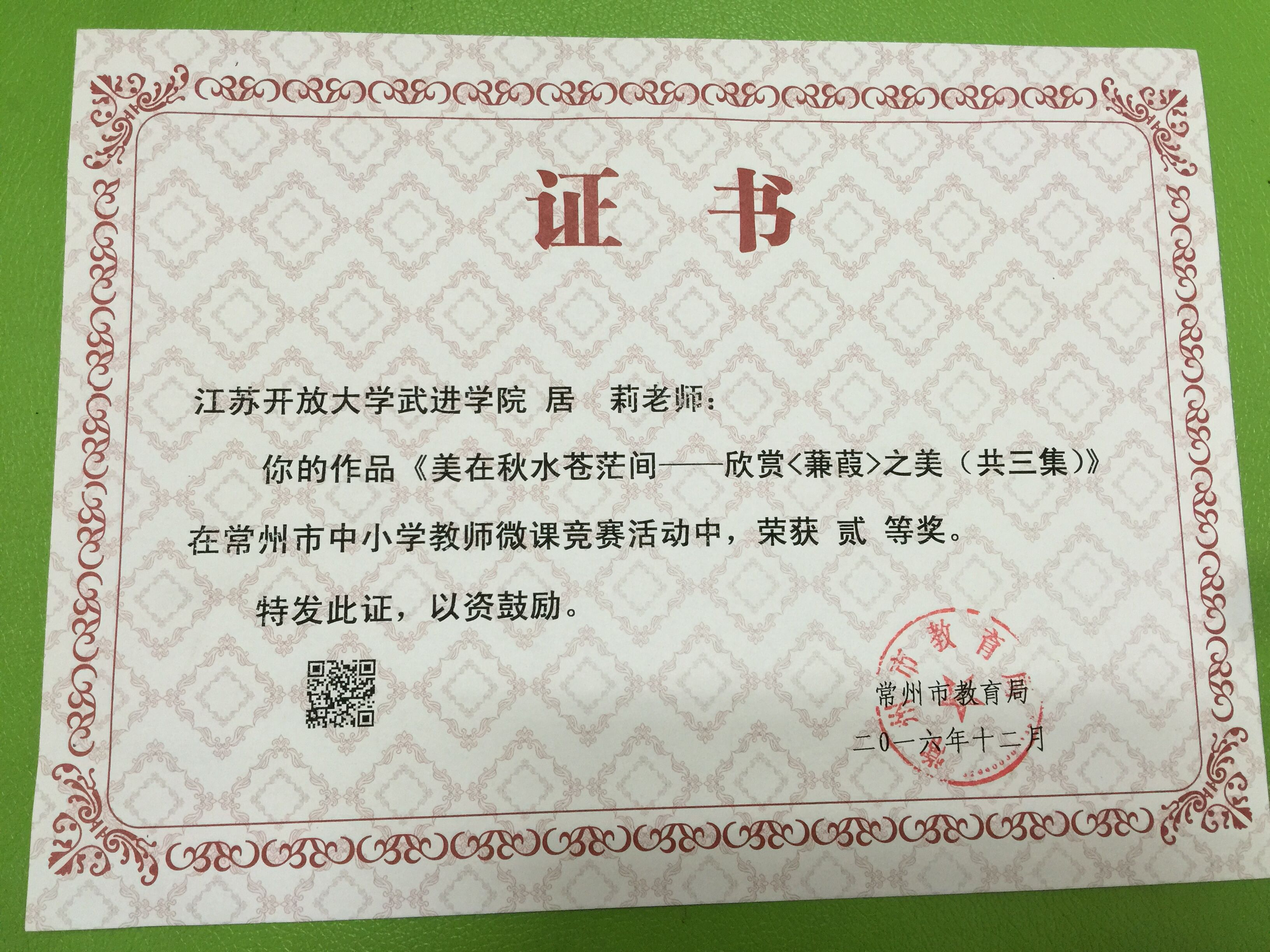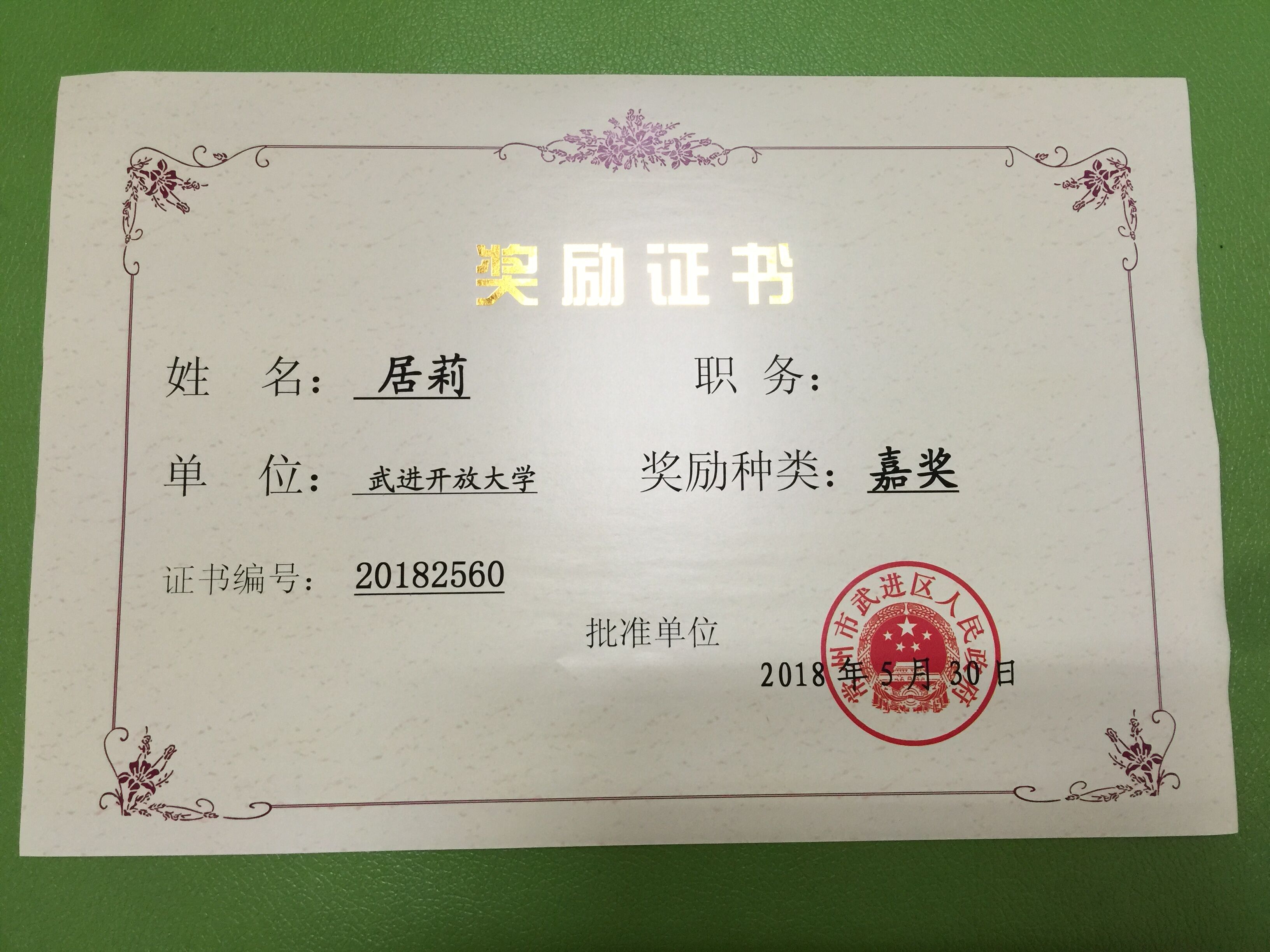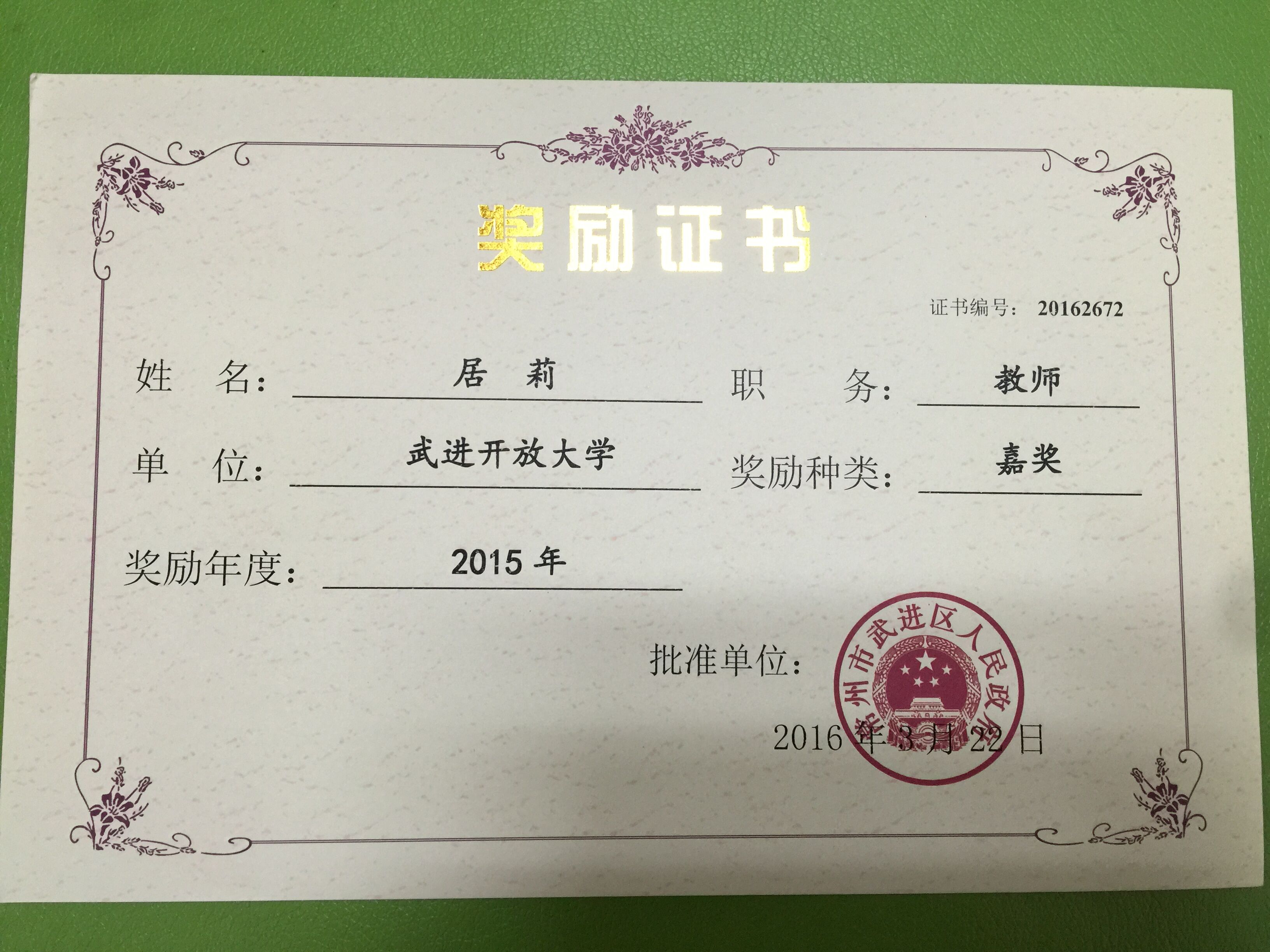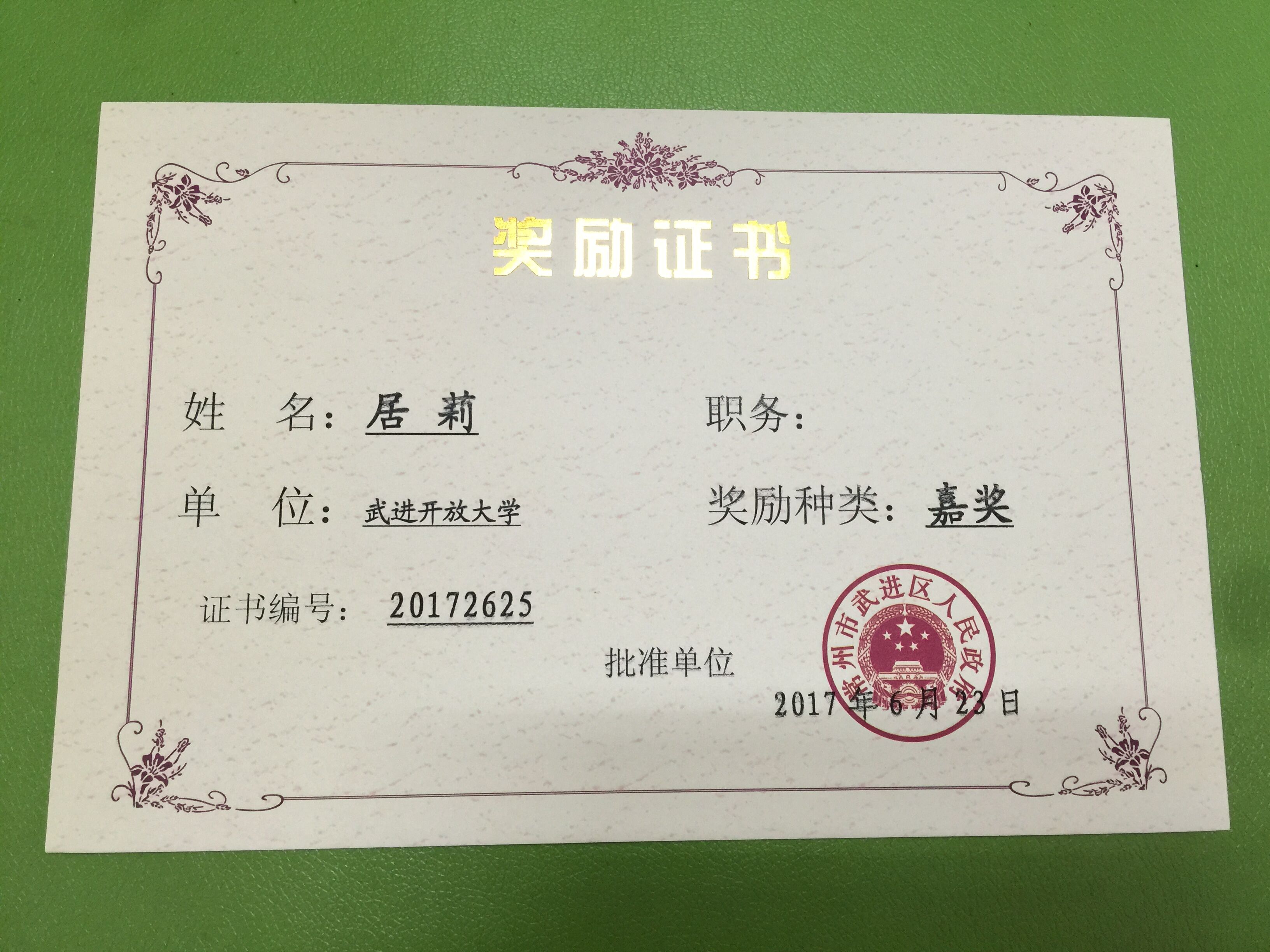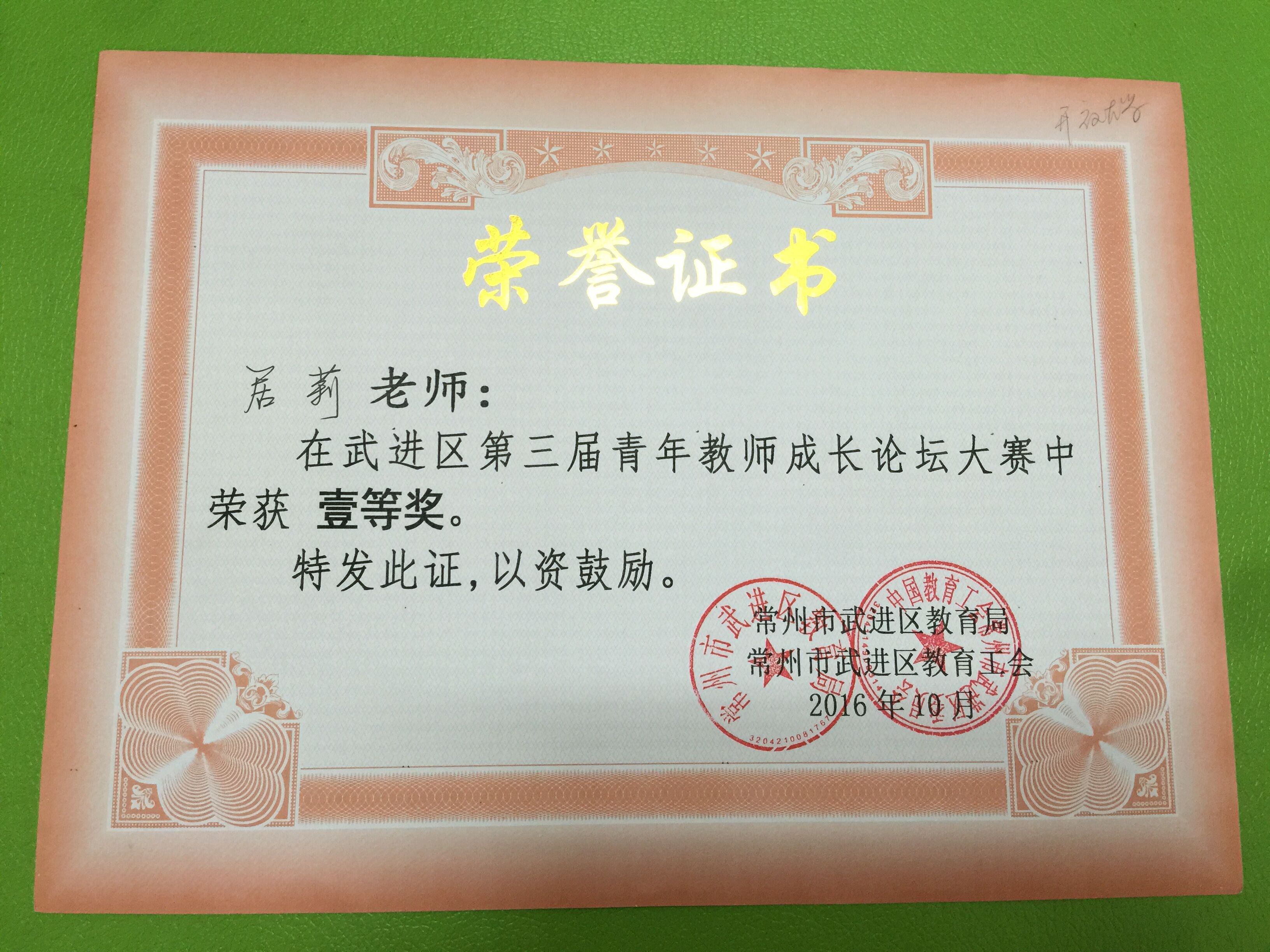 工作以来,多次获校级优秀班主任,连续3年获武进区政府嘉奖,曾获武进区青年教师成长论坛一等奖,武进区中小学德育论文二等奖,江苏省教育科学研究院论文二等奖,江苏省第十届新世纪园丁论文大赛三等奖,江苏省心理学会论文评比一等奖,市级演讲比赛优秀指导教师。