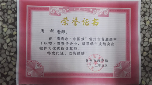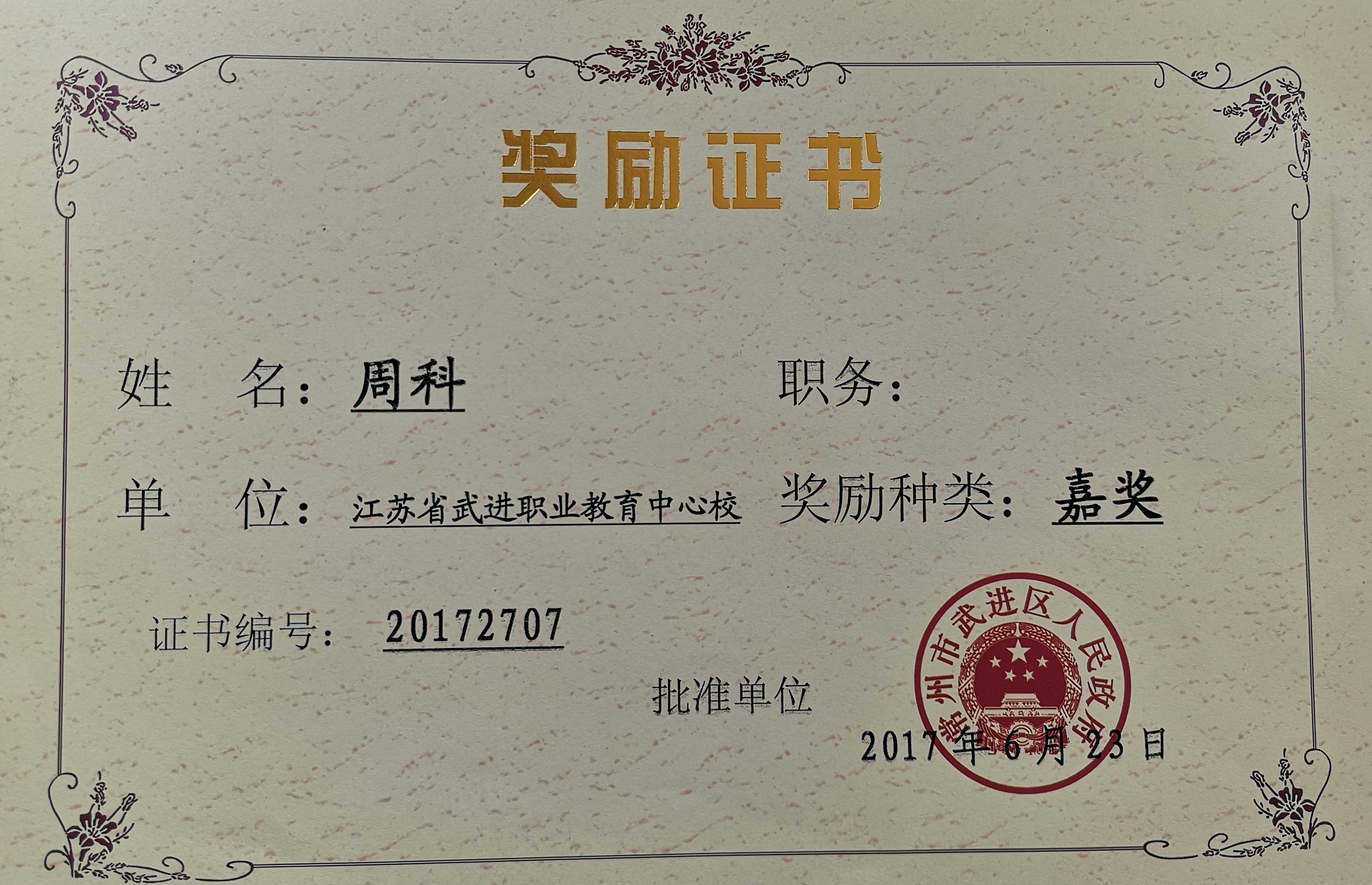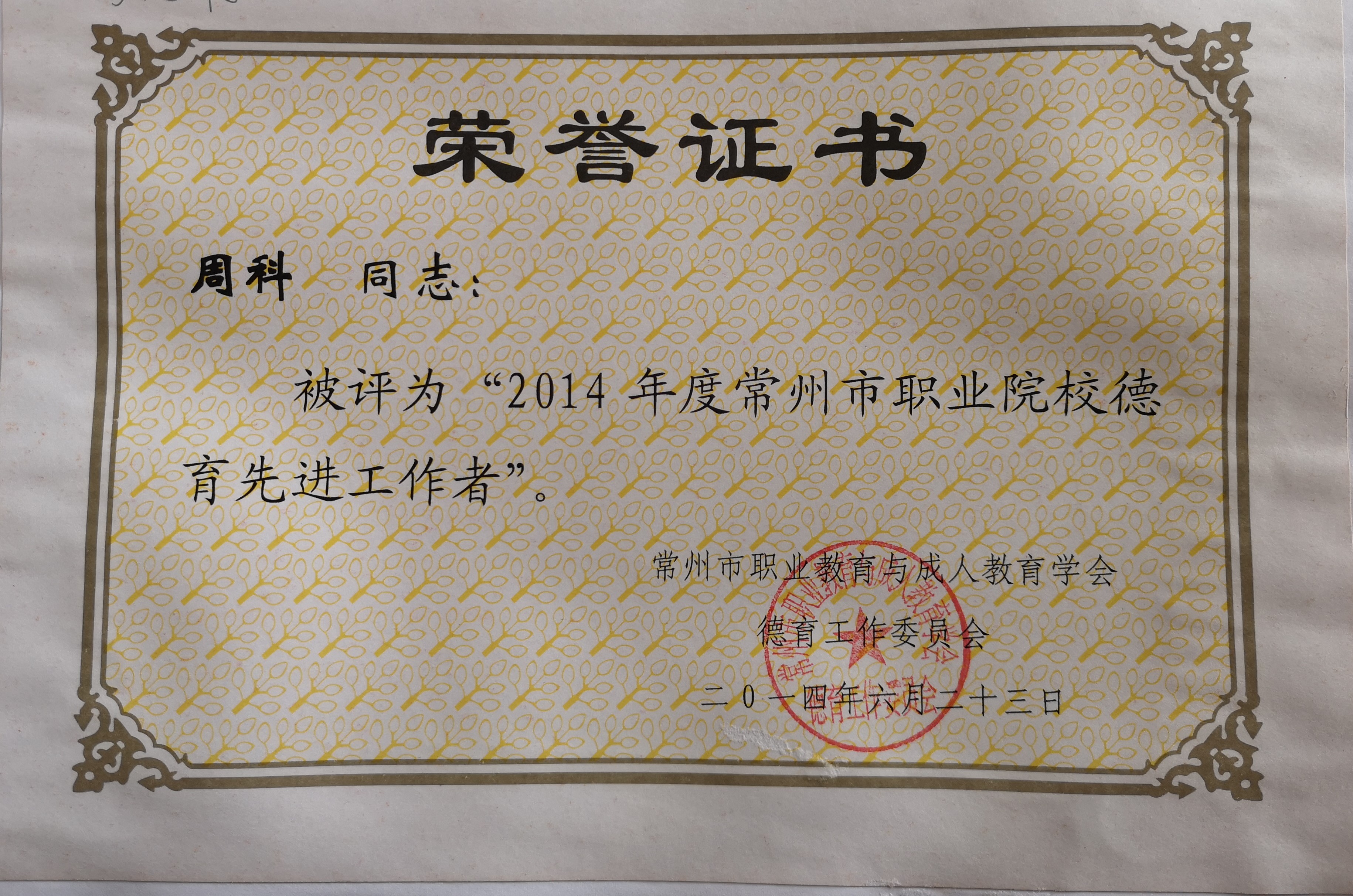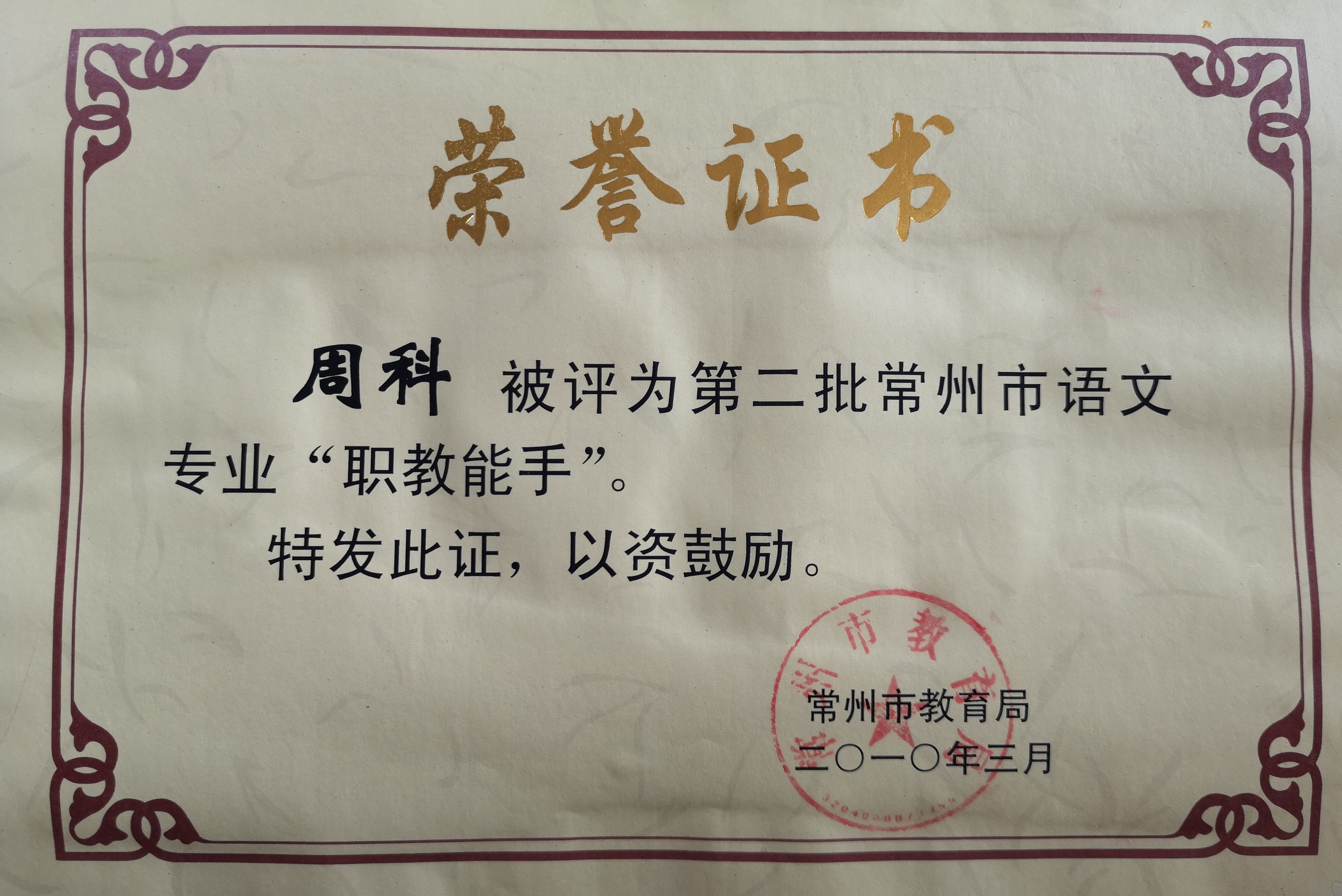 周科,男,生于1982年5月,中共党员,本科,高校教师资格,讲师,毕业于中央广播电视大学汉语言文学专业,现任江苏省武进职业教育中心校校团委副书记,任教机械工程系高职班语文,江苏省普通话水平测试员,江苏省语言文字规范化工作视导员,常州市朗诵吟诵协会会员,常州市开放大学演讲与朗诵工作室成员,指导节目《青春志中国梦》先后在江苏省和常州市中华经典诵读比赛中获一等奖,个人多次荣获区政府嘉奖等荣誉。