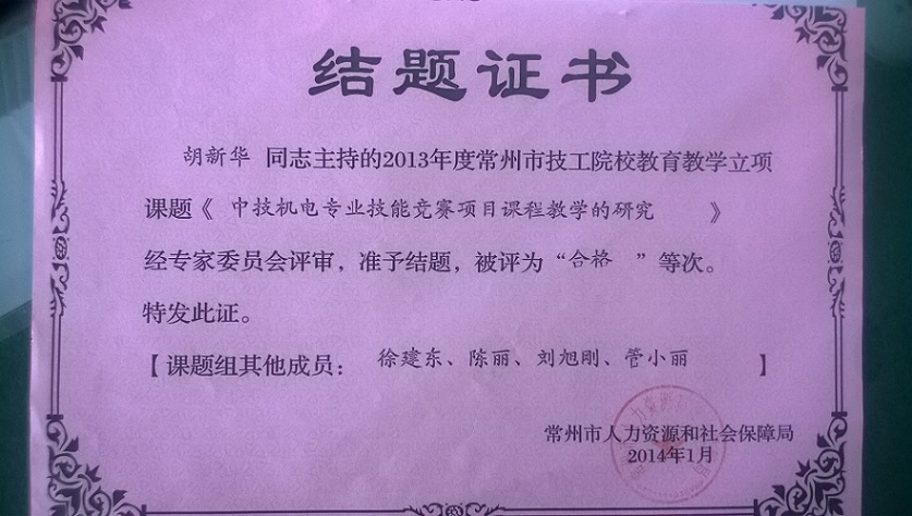 市级课题结题证书:中技机电专业技能竞赛项目课程的教学研究