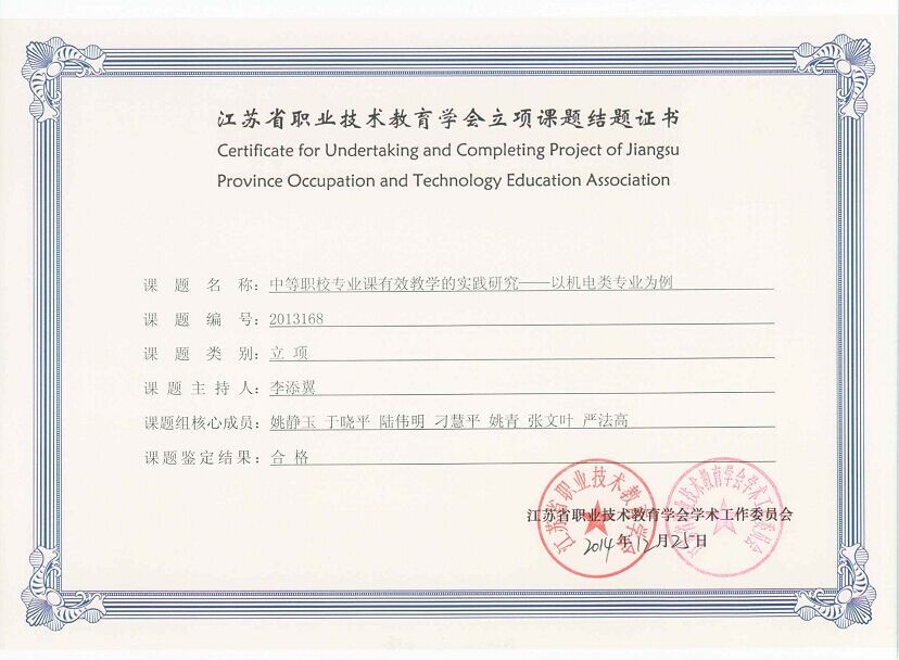 省级课题结题证书:中等职校专业课有效教学的实践研究