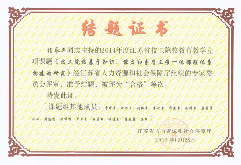 省级课题结题证书:技工院校基于知识、能力与素质的课程体系构建的研究