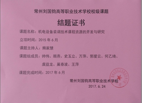 校级课题结题证书:机电设备装调技术课程资源的开发与研究