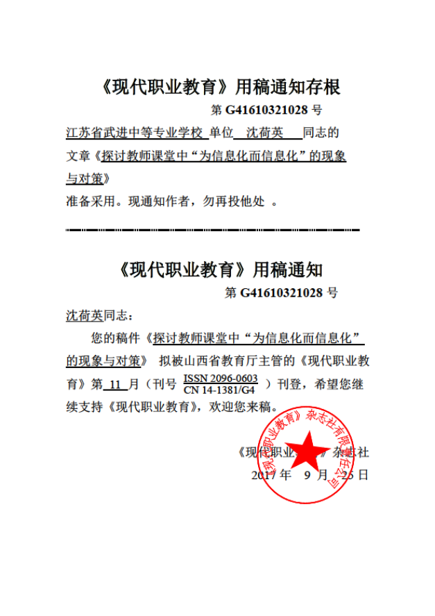 沈荷英发表论文:《探讨教师课堂中“为信息化而信息化”的现象与对策》