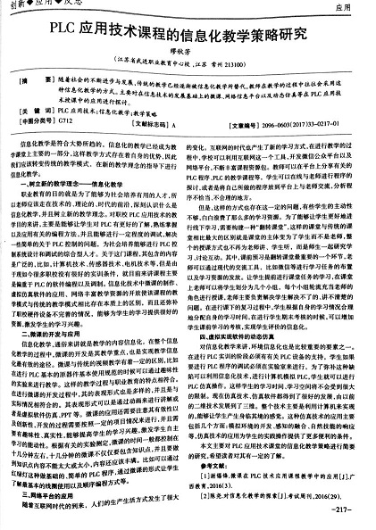 缪秋芳发表论文:PLC应用技术课程的信息化教学策略