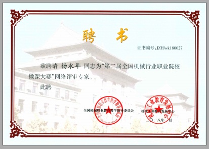 杨永年-“全国机械行业职业院校微课大赛”网络评审专家-2018