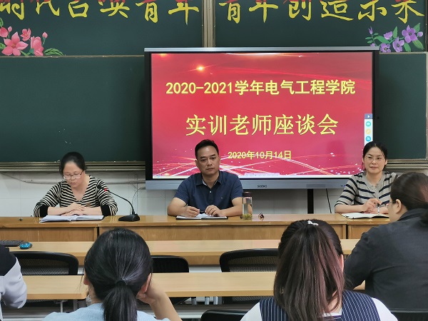 10月14日下午,电气工程学院在二楼会议室召开了全体实训老师座谈会。召开这次座谈会的目的在于广泛听取各位实训老师对实训室如何管理、实训教师如何向理实一体化转型、双带教学如何科学实施等方面的意见,从而进一步深化教学改革,提高实训课程的教学质量。