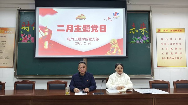 2月26日下午,电气工程学院党支部在二楼党员活动室开展了二月份主题党日活动,全体党员参加了会议。会议由支部副书记胡玲洁主持。