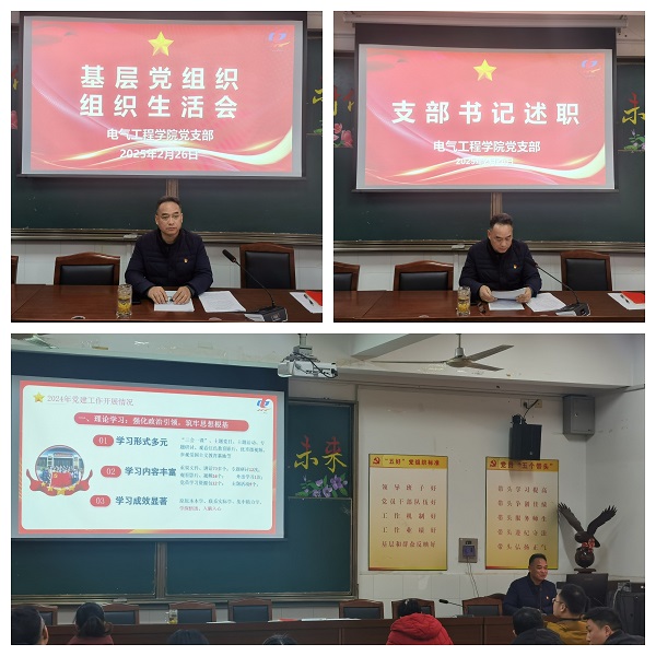 接着,支部书记蒋志方带领全体党员集中学习相关文件精神,并向党员大会述职,报告一年来的支部工作。2024年,电气工程学院党支部在校党委的正确领导下,秉持为党育人、为国育才的初心使命,扎实推进各项工作,取得了一系列成果,也经历了诸多挑战与考验。在今后的工作中继续守初心、担使命,狠抓落实,为学校高质量发展贡献力量。蒋书记还将会前梳理征求到的意见建议,向全体党员通报,提出了整改措施并开展批评和自我批评。