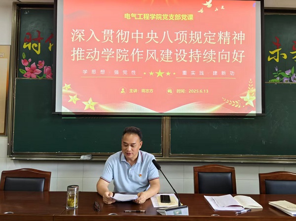 根据学校工作部署,结合电气学院工作实际,6月13日下午电气支部在二楼党员活动室,举行了八项规定精神学习教育专题党课,本次党课由支部书记、院长蒋志方同志主讲,主题为《深入贯彻中央八项规定精神,推动学院作风建设持续向好》。